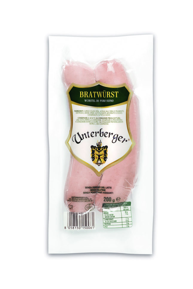 BRATWURST Unterberger I WURSTEL WURSTEL DI PURO SUINO GUSTO SAPORITO, LEGGERMENTE SPEZIATO Nome articoloArticoloFormatoConfezionePeso ProdottoPezzi/cartoneUsoScheda ProdottoBRATWURST 2 PZ Gr 200e512AsportoAtmGr [...]