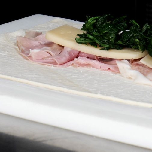3. Foderate la porzione centrale della sfoglia con il Prosciutto Cotto Natura, appoggiate sopra il formaggio Montasio, gli spinaci e ricoprite infine con la metà degli asparagi.