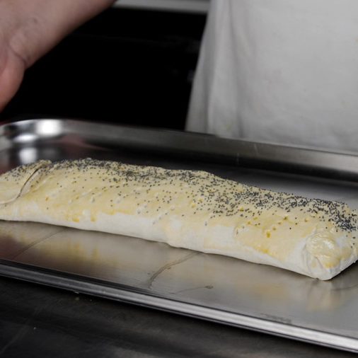 4. Chiudete arrotolando la sfoglia e spennellate con il tuorlo d’uovo.
