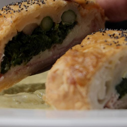 Lo strudel di prosciutto cotto e asparagi è uno strudel salato da presentare per un buffet, come antipasto o direttamente come secondo piatto. Tra gli ingredienti il Prosciutto Cotto Natura Bechèr, prodotto con l’esclusivo utilizzo di materia prima proveniente da animali nati ed allevati in Italia.