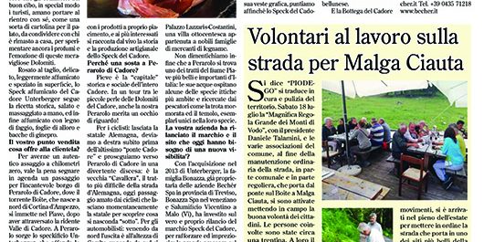 Sul numero di Agosto 2020 del periodico d’informazione IL CADORE – Intervista a pagina intera sule origini e sui punti di forza dello Speck del Cadore Unterberger: sapori e tradizioni delle Dolomiti bellunesi in una fetta di speck. In un tour tra le piccole perle delle Dolomiti del Cadore, una sosta di merito è la località di Perarolo di Cadore, dove nel 2013 la famiglia Bonazza ha acquisito la storica azienda Unterberger e ha rilanciato il marchio Speck del Cadore, per rafforzare ed impreziosire la propria presenza sul mercato, puntando sulla qualità del valore umano e delle risorse del territorio. Uno sguardo alla Bottega del Cadore, all’interno dello stabilimento Unterberger, con la vendita al dettaglio delle migliori specialità di speck, wurstel, braciole, stinchi, pancette, salami, sopresse, pendole e guanciale.