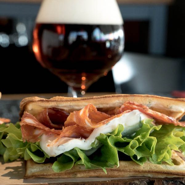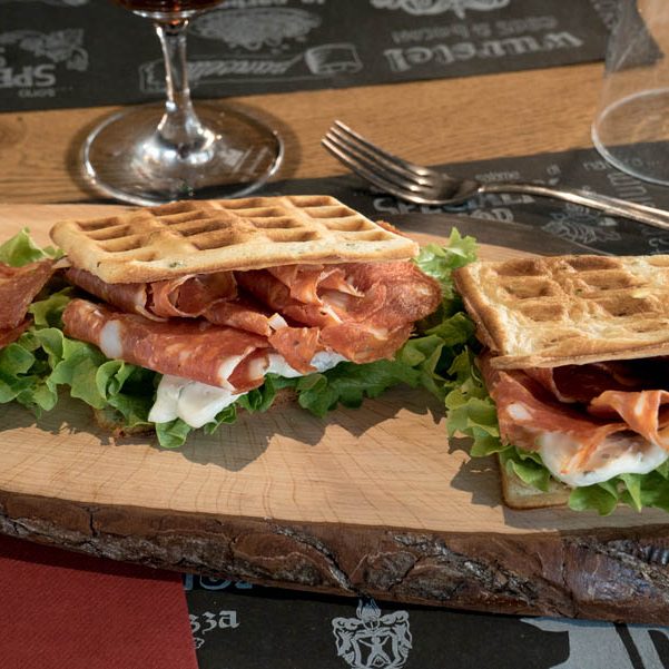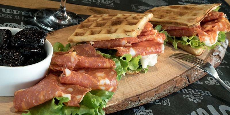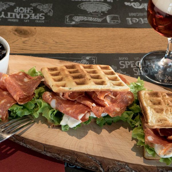 Conoscete i waffle? Dolci o salati, sono sandwich formati da due waffle che, nella versione salata, sono preparati con impasto aromatizzato all’erba cipollina e al loro interno racchiudono farciture saporite a base di insalatine, formaggi e qui arricchite dalla stuzzicante Spianata Calabra piccante Bechèr.